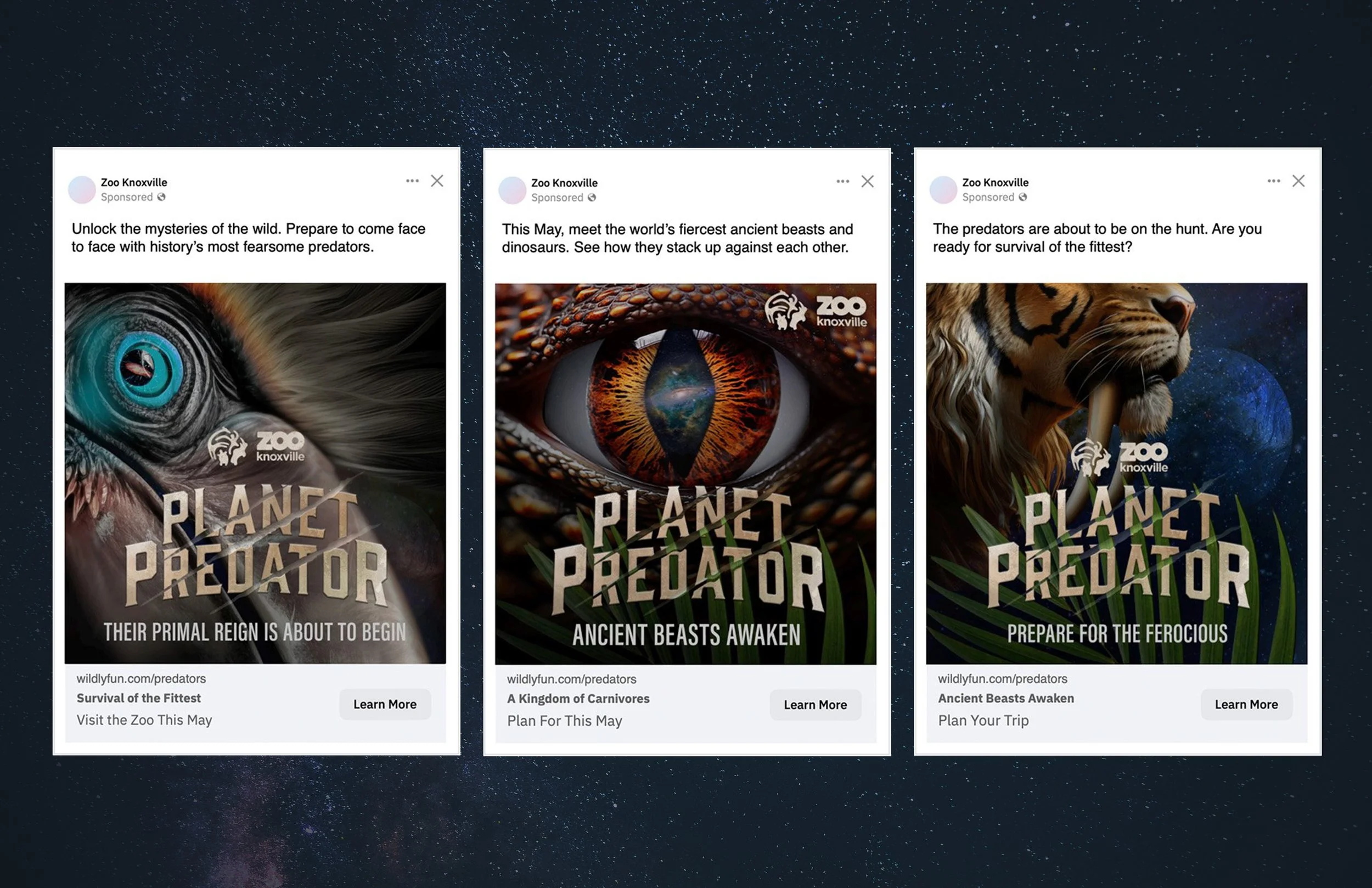 Using cutting-edge AI, Zoo Knoxville’s Planet Predator campaign brought apex predators—Megalodon, Terror Bird, Smilodon, and more, into the modern world. The campaign unfolded across three phases—Teaser, Launch, and Refresh—each designed to create anticipation and attendance for the limited-time exhibit. For the teaser campaign, we focused on macro moments of these beasts to pique curiosity. Almost as if these are animals that you may be familiar with. During the opening however, we played an almost National Geographic moment, playing to the majesty of these creatures and showing them in their full form. This award winning cross-platform campaign was brought to life through social and paid ads, billboards, animated video, radio and installation.